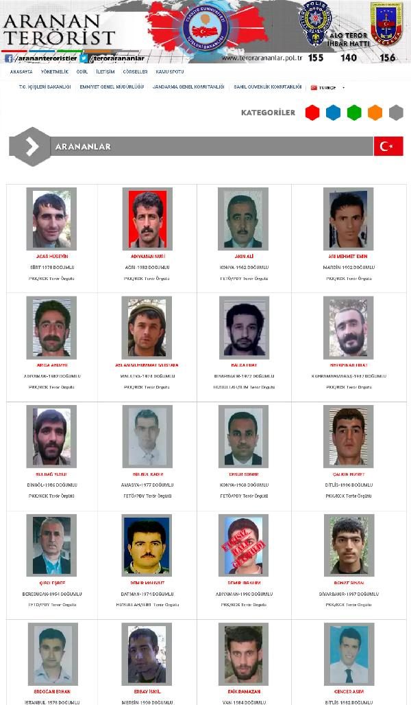 "Terörle Mücadele Kanunu kapsamına giren suçların faillerinin yakalanmasına yardımcı olanlara verilecek ödül bilgileri ve 5 ayrı renk kategorisinde aranan terör örgütü mensuplarının bilgilerinin yer aldığı www.terorarananlar.pol.tr isimli web sitesinde bulunan 69 terör örgütü mensubu ölü olarak, 14 terör örgütü mensubu ise sağ olarak etkisiz hale getirilmiştir. Ayrıca vatandaşlarımızca yapılan ihbarlar sonucunda www.terorarananlar.pol.tr isimli web sitesinde bulunmayan 493 terör örgütü mensubu ölü olarak, 33 terör örgütü mensubu ise sağ olarak etkisiz hale getirilmiş, önemli miktarda silah, mühimmat, patlayıcı madde ve bomba yapım malzemesi ele geçirilmiş ve böylelikle olması muhtemel birçok terör eyleminin engellenmesi sağlanmıştır."