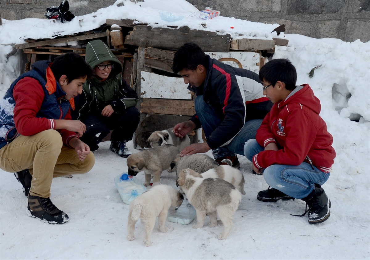 KARS (AA) - Kars'ın Sarıkamış ilçesinde öğrenciler, üşümemeleri için yuva yaptıkları sokak köpeği ile 10 yavrusunu, harçlıklarıyla aldıkları ve çevreden topladıkları yiyeceklerle besliyor.