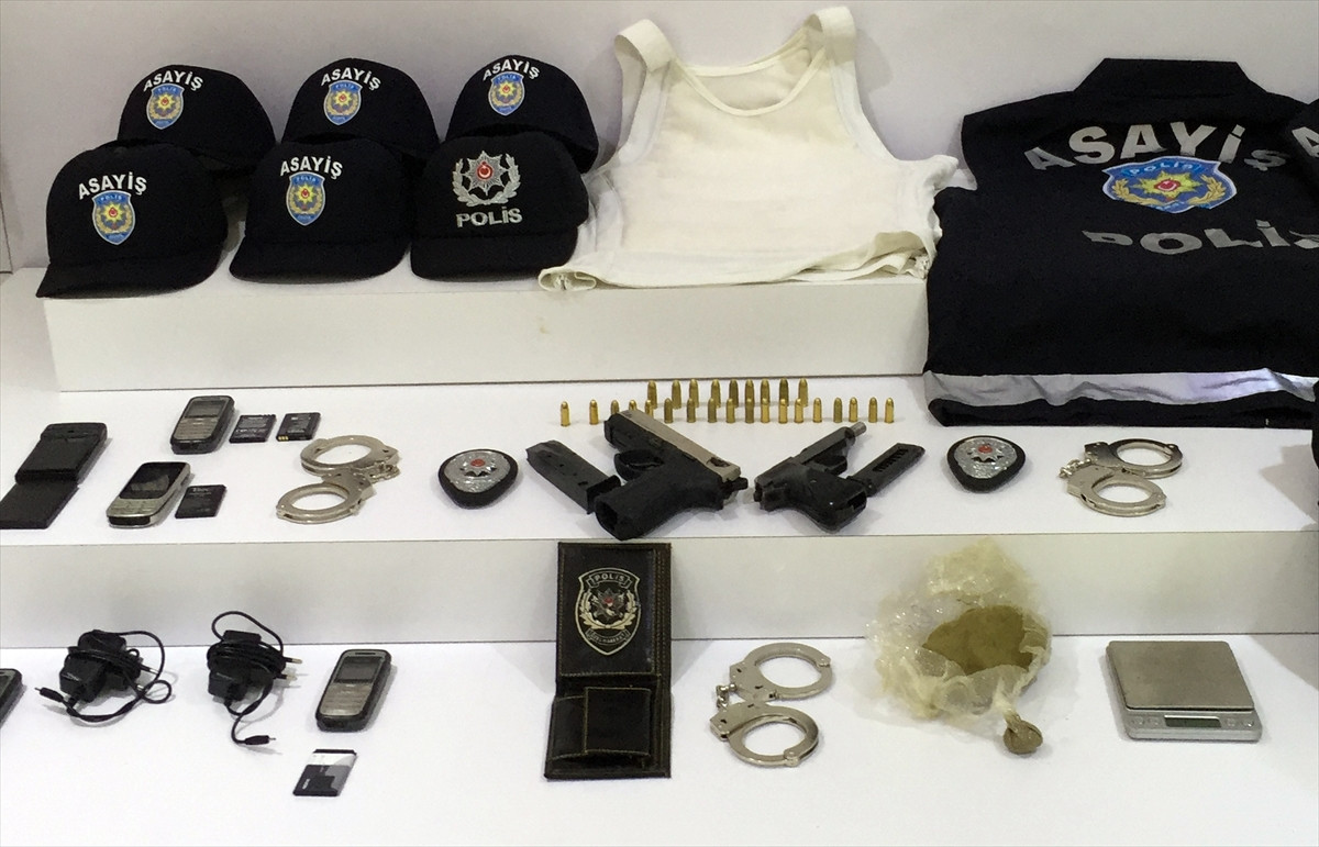 Karataş'ın saklandığı evde yapılan aramada 1 tabanca çok sayıda fişek, 5 polis yeleği, 6 polis şapkası, 3 kelepçe, 3 polis rozeti, 4 cep telefonu, 220 gram uyuşturucu madde ve hassas terazi ele geçirildi.