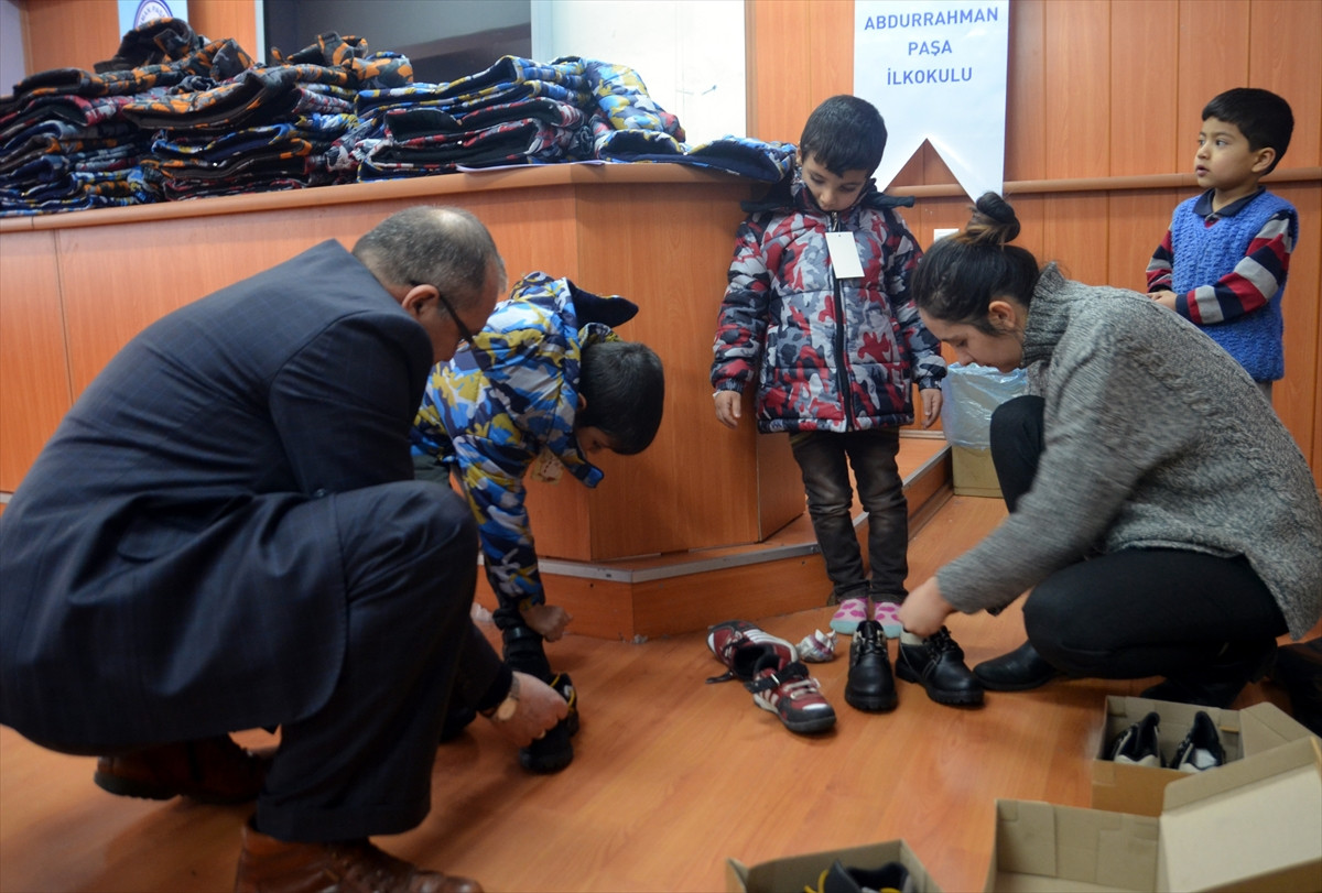 Kent merkezindeki Abdurrahmanpaşa İlkokulunda hazırlanan sosyal proje kapsamında, 64'ü sığınmacı ailelerin çocuğu 81 öğrenciye kaban ve bot yardımı yapıldı.