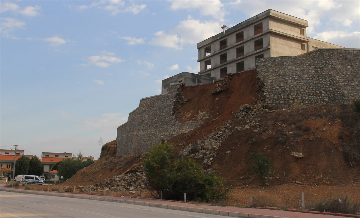 Merkez Çukurova ilçesi Kurttepe Mahallesi'nde yapımı devam eden binanın yükselti üzerine kurulan istinat duvarının bir bölümü, toprak kayması sonucu yola doğru çöktü.