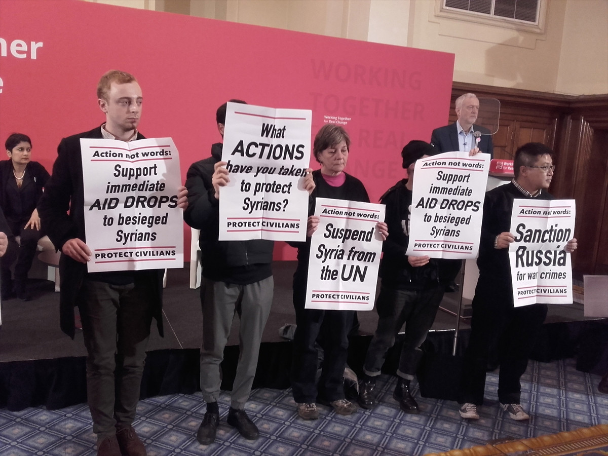 Corbyn'in Londra'da Dünya İnsan Hakları Günü sebebiyle yaptığı konuşmada, Suriye'deki insani krize dikkati çekmek isteyen bir grup sahneye çıktı.