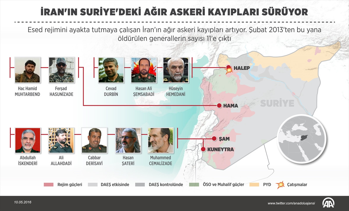 ANKARA (AA) - Beşşar Esed rejimi için savaşmak üzere Suriye'ye ordu ve özel kuvvetler mensuplarını sevk eden İran'ın ağır askeri kayıpları artıyor. Şubat 2013'ten bu yana öldürülen generallerin sayısı 11'e çıktı. İran, Suriye'ye Esed rejiminin çöküşe geçtiği 2012 sonlarından itibaren Devrim Muhafızları Ordusu askerlerini gönderiyor. Rusya'nın 13 Mart'ta güçlerini azaltma kararını bildirmesi üzerine İran, doğacak boşluğu kapatmak için İran ordusu içindeki özel kuvvetleri de Suriye'ye sevk etti. İran askerleri, halihazırda yoğunlukla Halep'in güneyinde muhaliflerle çatışıyor. AA muhabirinin İran basınından yaptığı derlemeye göre, Şubat 2013'ten bu yana Suriye'deki çatışmalarda 11 İranlı general öldürüldü. Son olarak geçen cuma, Halep'in güneyindeki Han Tuman beldesinde Tuğgeneral Cevad Durbin hayatını kaybetti. Daha önce de Şam, Halep ve Kuneytra bölgelerinde Hasan Şateri, Muhammed Cemalizade, Abdullah İskenderi, Cabbar Derisavi ve Ali Allahdadi isimli generallerin hayatını kaybettiği İran basınına yansımıştı. Geçen sene ekim ayında da Devrim Muhafizları Ordusuna bağlı Kudüs Gücü Komutanı Kasım Süleymani'nin yardımcısı Tuğgeneral Hüseyin Hemedani Halep'te, "Ebu Zehra" adıyla bilinen Hac Hamid Muhtarbend ve Ferşad Hasunizade adlı iki Devrim Muhafızları generali de Hama'da öldürülmüştü. Devrim Muhafızlarından Tuğgeneral Muhsin Kacariyan ile Tuğgeneral Hasan Ali Şemsabadi de Suriye'deki çatışmalarda öldürülen generaller arasındaydı. İran, Han Tuman'da geçen cuma Tuğgeneral Durbin ile beraber Devrim Muhafızları Ordusuna bağlı Kudüs Karargahı Komutanlarından Şefiğ Şefii'nin de olduğu toplam 15 askerini kaybetti. İran basını, geçen ay içinde aralarında bir albayın da olduğu toplam 23 askerin Suriye'deki çatışmalarda öldüğünü bildirmişti. Nisan ayındaki kayıplardan en üst düzeydeki isim Devrim Muhafızları Ordusu mensubu Albay Maşallah Şemse olarak göze çarpmıştı. Geçen ay, Suriye'ye ilk defa giren İran özel kuvvetler mensupları 45'inci Komando Tugayı Albay Müçteba Zülfikar Neseb, 258'inci Komando Tugayı Yüzbaşı Murteza Zerherend ve 65'inci Komando Tugayı Teğmen Müçteba Yadullahi Münferid ve 65'inci Tugay mensubu Muhsin Keytaslu da Halep'in güneyindeki çatışmalarda öldürülmüştü. İranlı Öğrenciler Haber Ajansı'na (ISNA) göre Devrim Muhafızları Komutanlığına bağlı Mazenderan Kerbela Kolordusu'nun Eski Komutan Vekili ve Danışmanı Eynullah Tebrizi dün, İran'ın Suriye'de 2012'den bu yana yaklaşık bin 200 "savaşçı" kaybettiğini söylemişti.