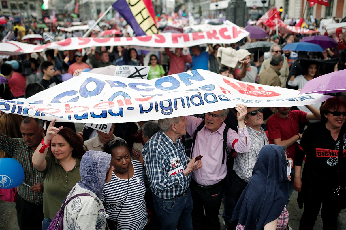 Başkent Madrid'deki gösterilerin odak noktası Sol Meydanı oldu. Dört koldan Sol Meydanı'na giren göstericiler, 2008 yılında başlayan ekonomik krizden dolayı uygulanan kemer sıkma politikalarıyla kaybettikleri sosyal haklarının ve özgürlüklerin geri verilmesini istedi.