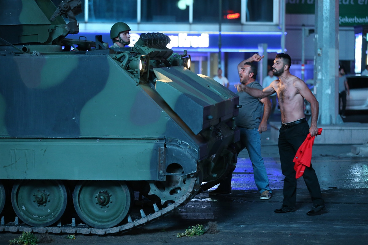 ANKARA (AA) - Kızılay Meydanında askeri kalkışmayı protesto etmek için toplanan vatandaşlar, Kızılay'dan geçiş yapan tankların ilerleyişini taş ve sopalarla durdurmaya çalıştı.