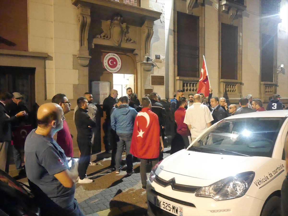Türkiye'nin Strasbourg Başkonsolosluğu önünde toplanan Türk vatandaşları, "Darbeye hayır", "Erdoğan yanındayız", "Büyük Türkiye", "Türkiye sana canım feda" sloganları attı.