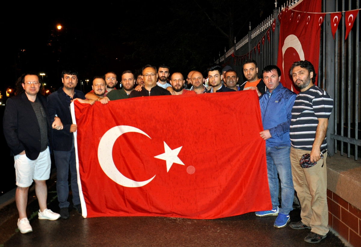 Türkiye'nin Budapeşte Büyükelçiliği önünde toplanan onlarca kişi ellerinde Türk bayrakları ile İstiklal Marşı okuyup "Dik dur eğilme, bu millet seninle" sloganları ile İstanbul ve Ankara'da gerçekleştirilen kalkışmaya tepki gösterdi.