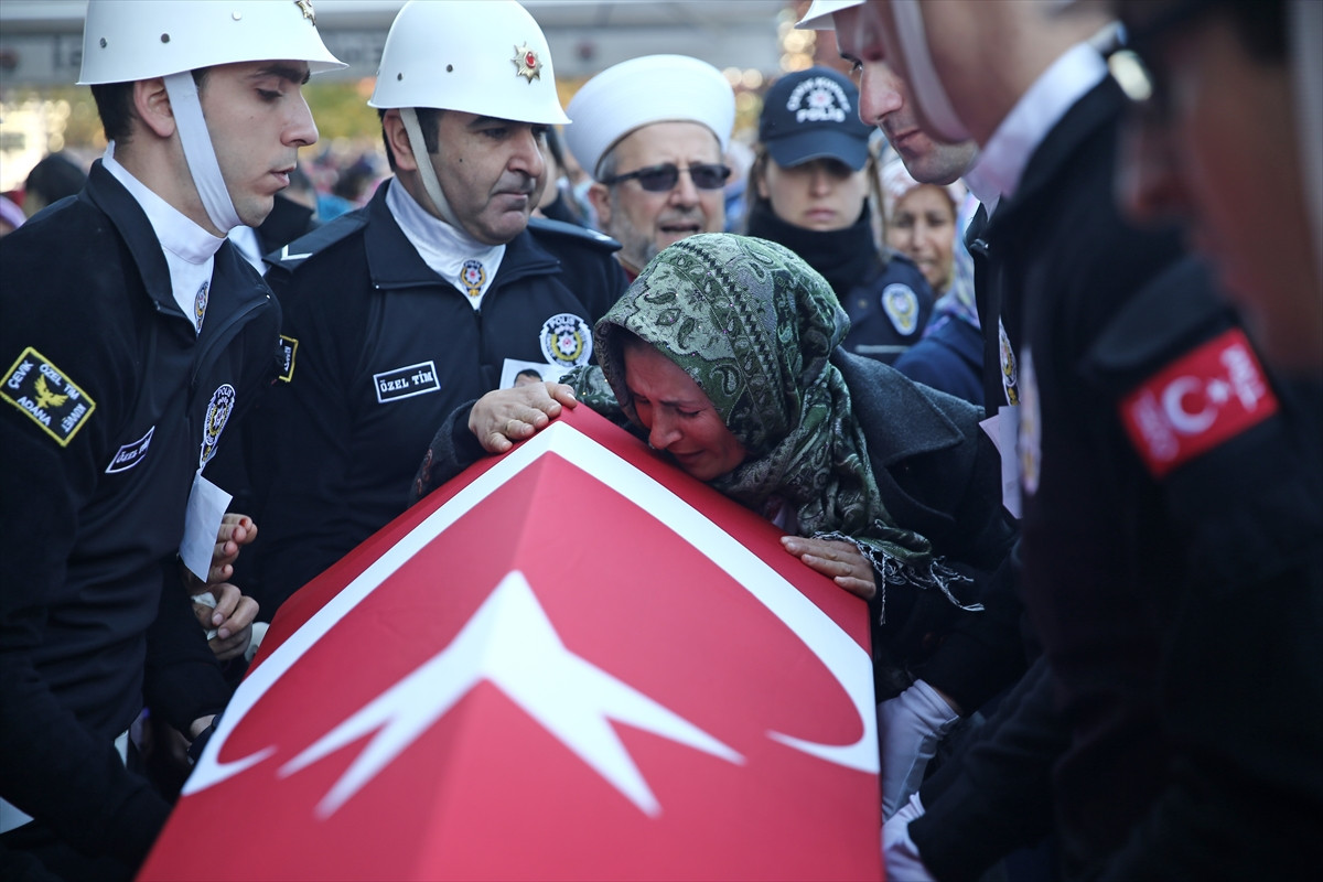 Beşiktaş Vodafone Arena yakınlarında önceki gece düzenlenen terör saldırısında şehit olan polisler Mehmet Atıcı (22) ve Adem Oğuz'un (30) Türk bayrağına sarılı naaşları, Merkez Sabancı Camisi'ne getirildi.