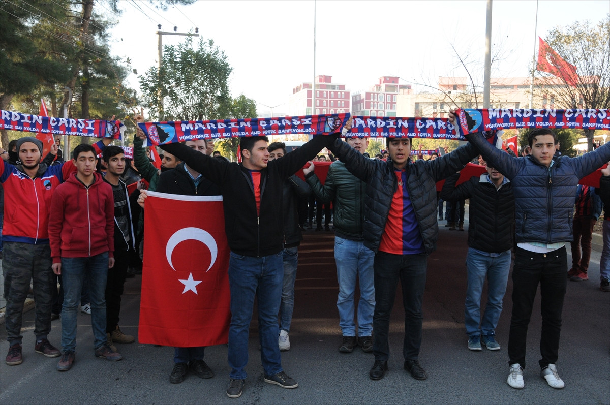 Sendikanın 13 Mart Mahallesi'ndeki şubesi önünde toplanan grup, ellerindeki Türk bayrakları ve sloganlar eşliğinde Yenişehir Mahallesi'nde bulunan Mardin Karayolları Parkı'na kadar yürüdü.