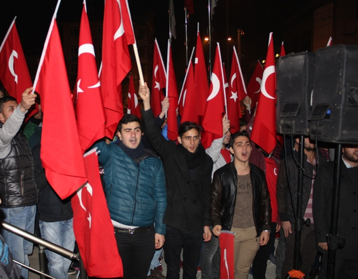 Adnan Menderes Kültür Merkezi önünde toplanan gruptakiler, ellerinde Türk bayraklarıyla saldırıya tepki gösterdi.