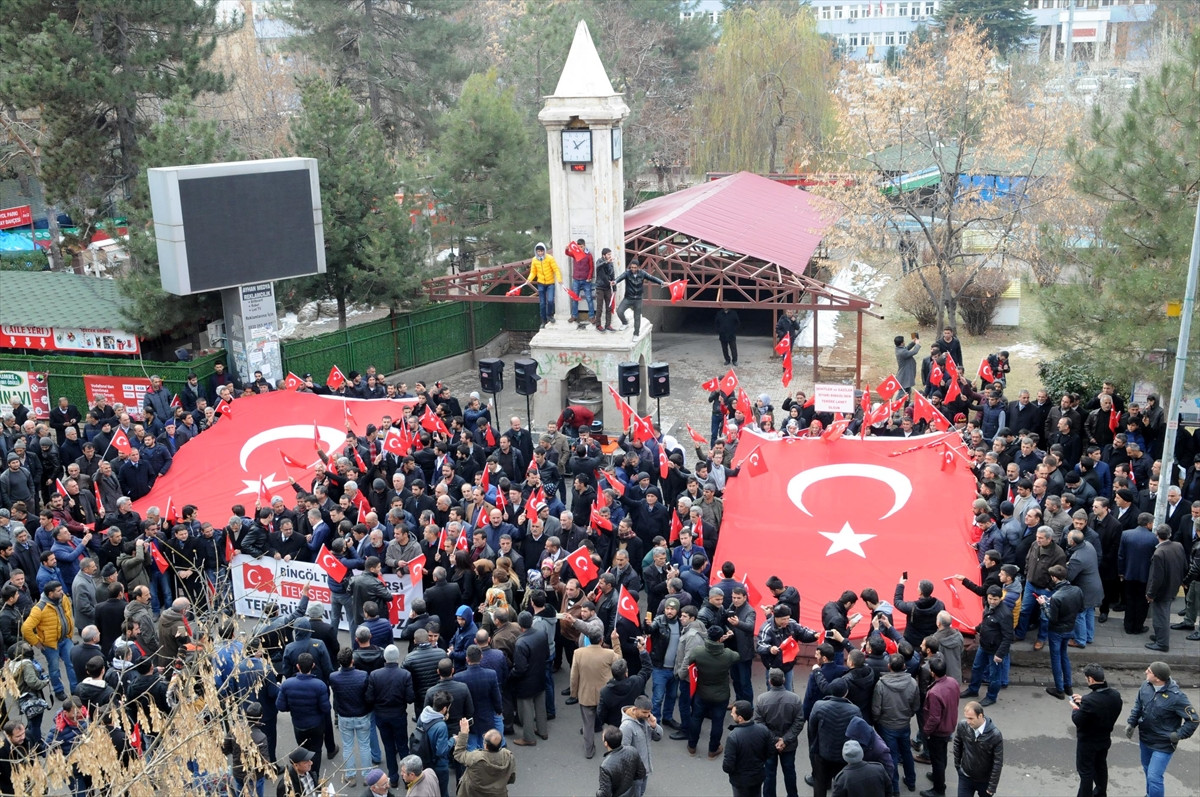 Bingöl Şehit Aileleri Gazileri ve İnsan Hakları Derneği (BİŞHAK) öncülüğünde Yenişehir Mahallesi'ndeki Saat Kulesi önünde bir araya gelen dernek üyeleri ve vatandaşlar, terör örgütü PKK'yı lanetledi.