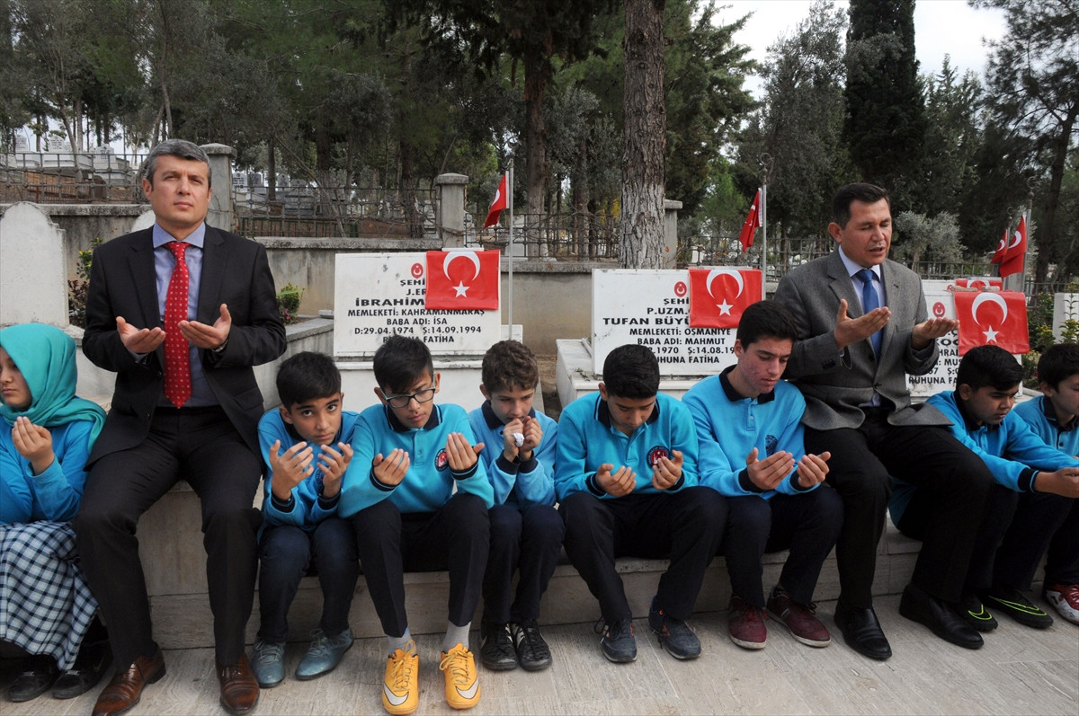 OSMANİYE (AA) - Osmaniye'nin Kadirli ilçesinde bir grup öğrenci, İstanbul Beşiktaş'ta meydana gelen saldırıda şehit düşen polis memurları için dua edip şehitlikte mezarlara karanfil bıraktı.