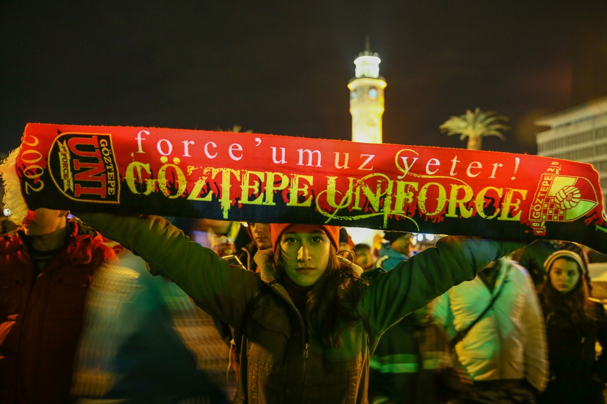 Konak metro istasyonu önünde, Göztepe, Karşıyaka, Altay, Altınordu, Galatasaray, Beşiktaş, Fenerbahçe ve Anadolu takımlarının taraftar grupları bir araya geldi.