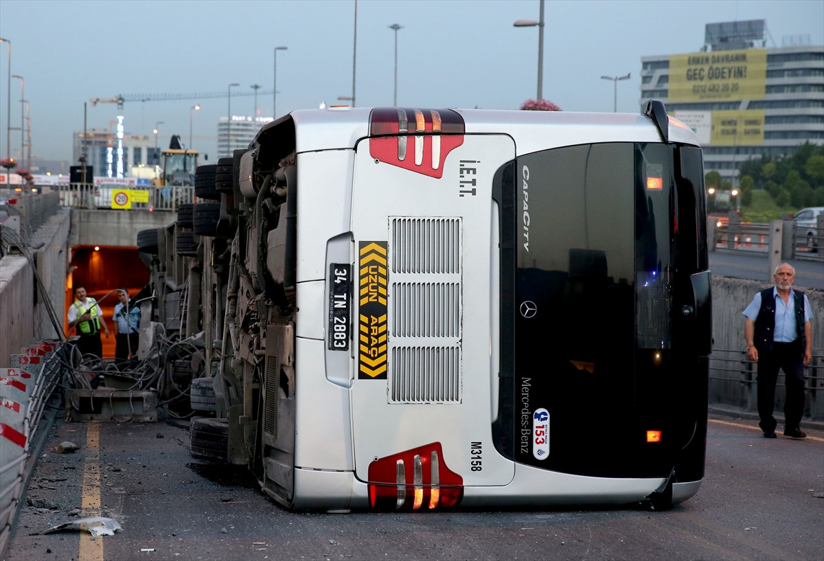 Zeytinburnu'nda metrobüsün manevra alanına devrilerek yan yatması sonucu 2'si ağır 10 kişi yaralandı. Alınan bilgiye göre, Zincirlikuyu-Avcılar seferini yapan 34 TN 2883 plakalı metrobüs, Cevizlibağ'da kontrolden çıkarak bariyerlere çarptı. Çarpmanın etkisiyle araç yaklaşık 5 metre yüksekliğindeki manevra alanına düşen metrobüs yan yattı. Aracın camlarının kırılmasıyla yolcular kendi imkanlarıyla dışarı çıktı. İhbar üzerine olay yerine çok sayıda polis, sağlık ve itfaiye ekibi sevk edildi. Kazada, ilk müdahaleleri olay yerindeki sağlık ekiplerince yapılan 10 yaralı ambulanslarla çevredeki hastanelere kaldırıldı. Metrobüs sürücüsü ile bir yolcunun durumunun ciddi olduğu bildirildi. İtfaiye ekiplerinin de duman çıkan araca köpükle müdahale ettikleri görüldü. Polis ekipleri olay yerini emniyet şeridiyle çift taraflı trafiğe kapatırken, yan yatan aracı çıkarmak için itfaiye ekiplerinin çalışması sürüyor.