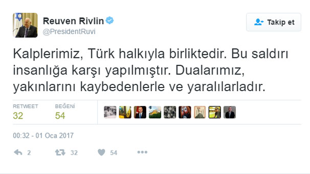 İsrail Cumhurbaşkanı Reuven Rivlin, İstanbul Ortaköy'de düzenlenen terör saldırısını kınadı.