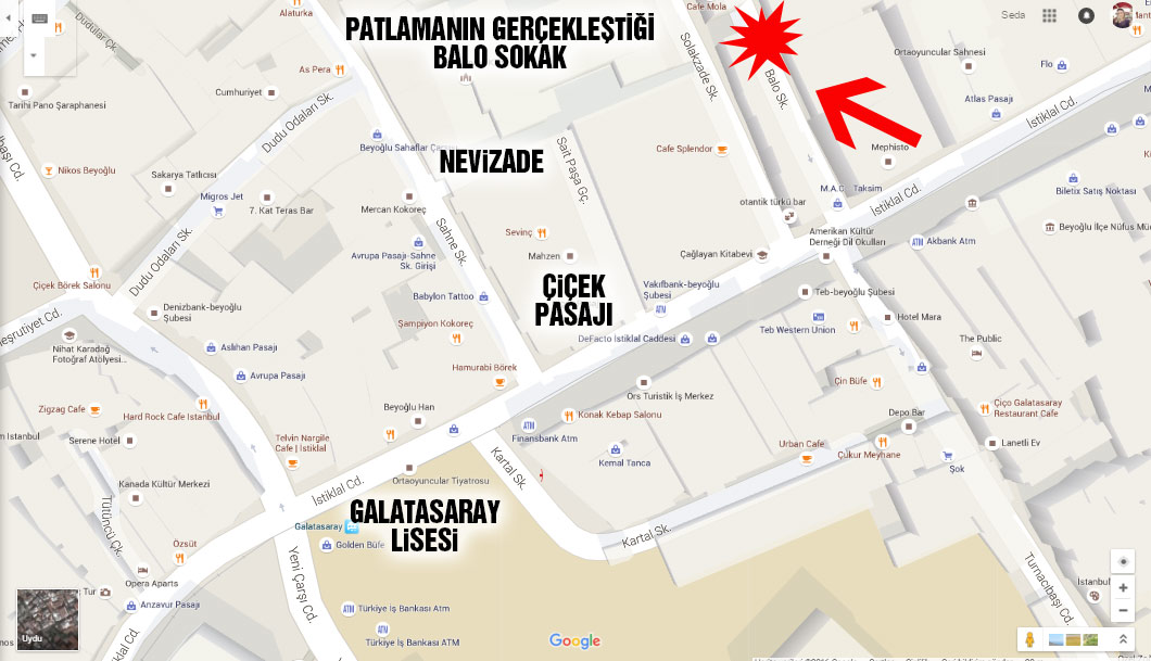 Beyoğlu’nda İstiklal Caddesi’nde bir patlama meydana geldi. Olay yerinden ilk gelen bilgilere göre, saldırıyı bir canlı bombanın gerçekleştirdiği ve 2 kişinin hayatını kaybettiği 7 kişinin de yaralandığı öğrenildi. İstiklal Caddesi’ndeki Balo Sokak’ta meydana gelen patlamada çok sayıda kişinin yaralandığı da gelen bilgiler arasında… Olay yerine çok sayıda ambulans ve polis sevk edildi. Polis, İstiklal Caddesi’nde araç ve yaya trafiğini kesti.