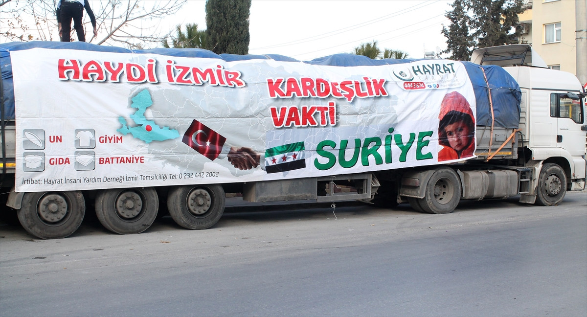 İZMİR (AA) - Hayrat İnsani Yardım Vakfı İzmir Bölge Temsilciliğinin organizasyonunda toplanan gıda ve giyim malzemelerinin bulunduğu 5 tır, dualar ile Halep'e hareket etti.