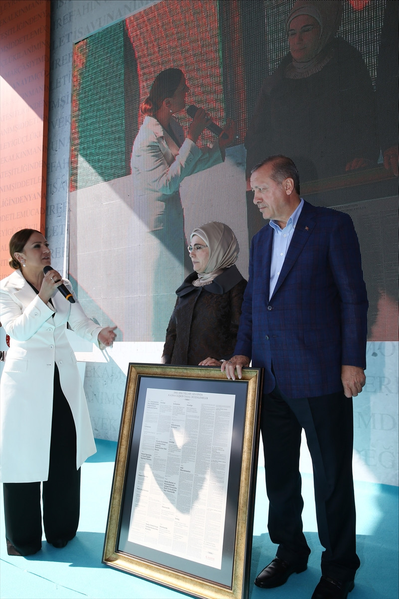 Törende daha sonra KADEM Başkanı Sare Aydın Yılmaz, üzerinde 2002-2016 yılları arasında kadına ilişkin yapılan tüm yasal düzenlemelerin yer aldığı tabloyu, Cumhurbaşkanı Erdoğan ve eşi Emine Erdoğan'a hediye etti.