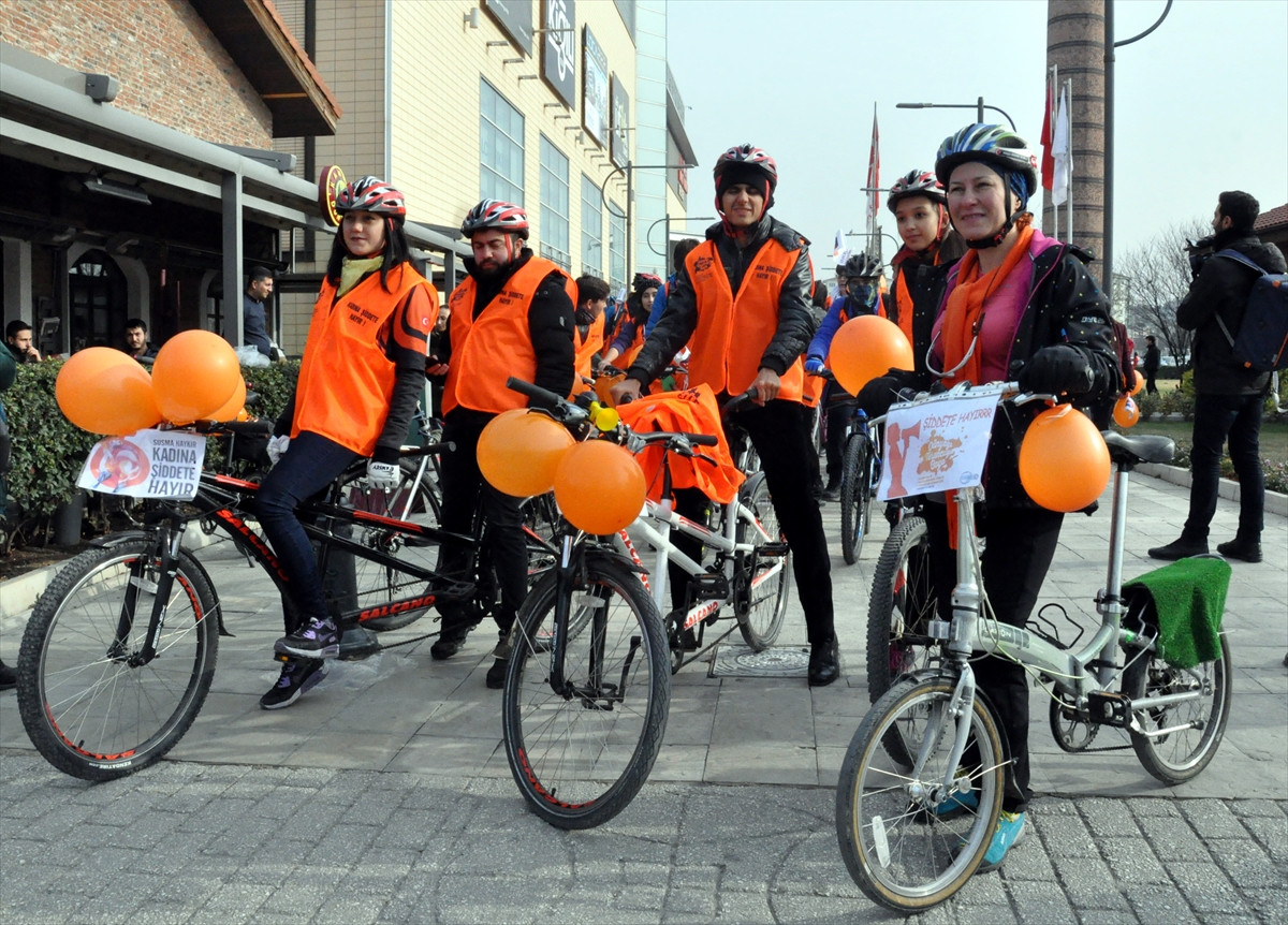 Yeni Bağlar Mahallesi'ndeki bir alışveriş merkezi önünde toplanan yaklaşık 200 kişi, bisikletlerini turuncu balonlarla süsleyerek, "Kadına şiddete son" yazıları astı.