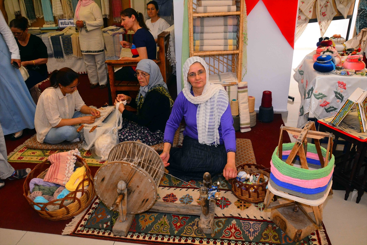 MUĞLA (AA) - Muğla'da, 300 yıllık tezgahlarda dokunmuş, unutulmaya yüz tutmuş halı ve kilim dokumacılığı ile ipek dokuma, deri işleme, bakır işlemeciliği, kırkyama, tığ ve şiş örgücülüğü, iğne oyası, hüsn-i hat sanatları gibi meslekleri hatırlatmak için ustaları tarafından hazırlanan ürünler sergilendi.