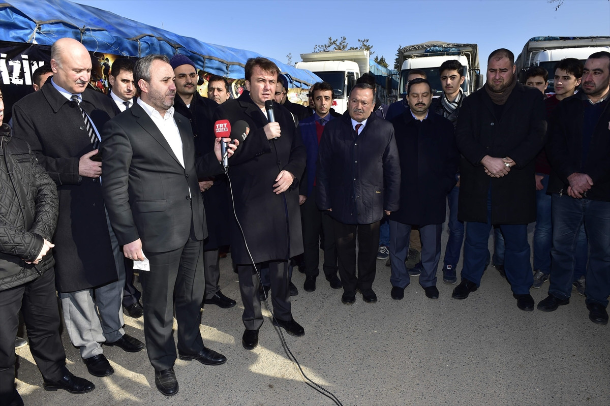 Konuşmanın ardından, 2 tır yaş sebze ve meyve, 1 tır battaniye, 1 tır giyim eşyası, 1 tır muhtelif ev eşyası ve okul sırası ile 1 tır gıdanın yer aldığı 6 tırlık konvoy dualarla Halep'ten tahliye edilen siviller için Suriye'ye gönderildi.