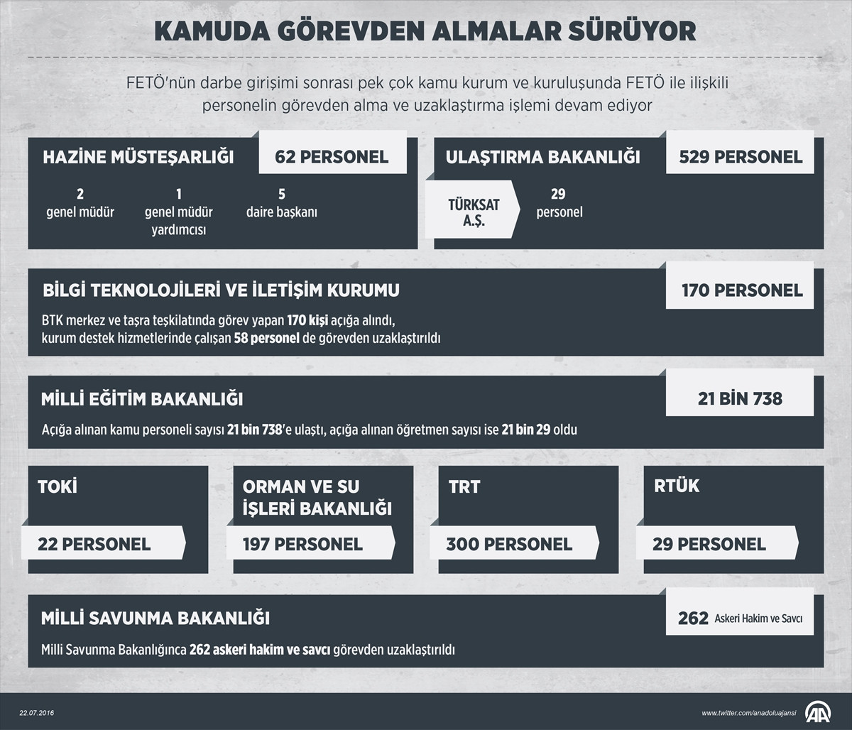 AA muhabirinin derlediği bilgiye göre, aralarında Bilgi Teknolojileri ve İletişim Kurumu (BTK), Radyo ve Televizyon Üst Kurulu (RTÜK), Başbakanlık Toplu Konut İdaresi (TOKİ) Başkanlığı, TÜRKSAT ve bakanlıkların da bulunduğu pek çok kamu kurum ve kuruluşunda görevden uzaklaştırma işlemi gerçekleştirildi.