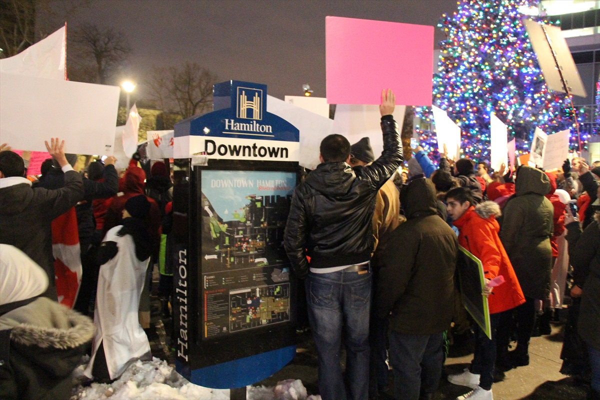 Kanada hükümeti tarafından geçen sene ülkeye getirilen 25 binden fazla Suriyeliden, Hamilton'da yaşayan yüzlercesi, Halep'teki insanlık dramı için sokağa döküldü.