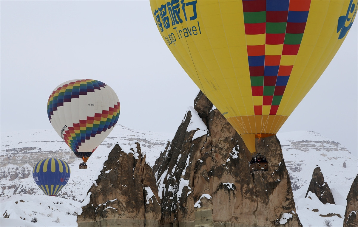 Göreme beldesinden havalanan onlarca balon Kapadokya semalarında güzel görüntüler oluştururken, turistler de beyaza bürünen peribacaları üzerinde manzaranın keyfini yaşadı.