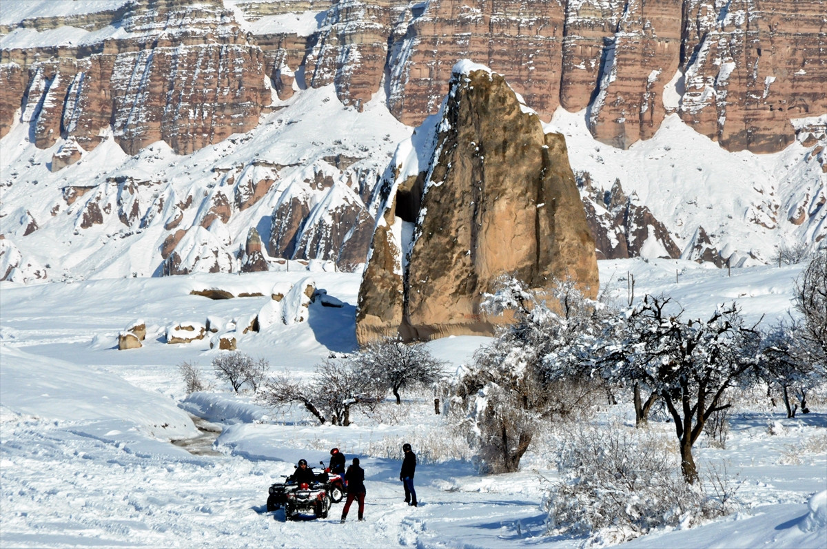 NEVŞEHİR (AA) - Türkiye'nin önemli turizm merkezlerinden Kapadokya bölgesinde, kar yağışı sonrası peribacaları ve doğal kaya oluşumlarını kaplayan beyaz örtü, eşsiz manzaralar oluşturdu.