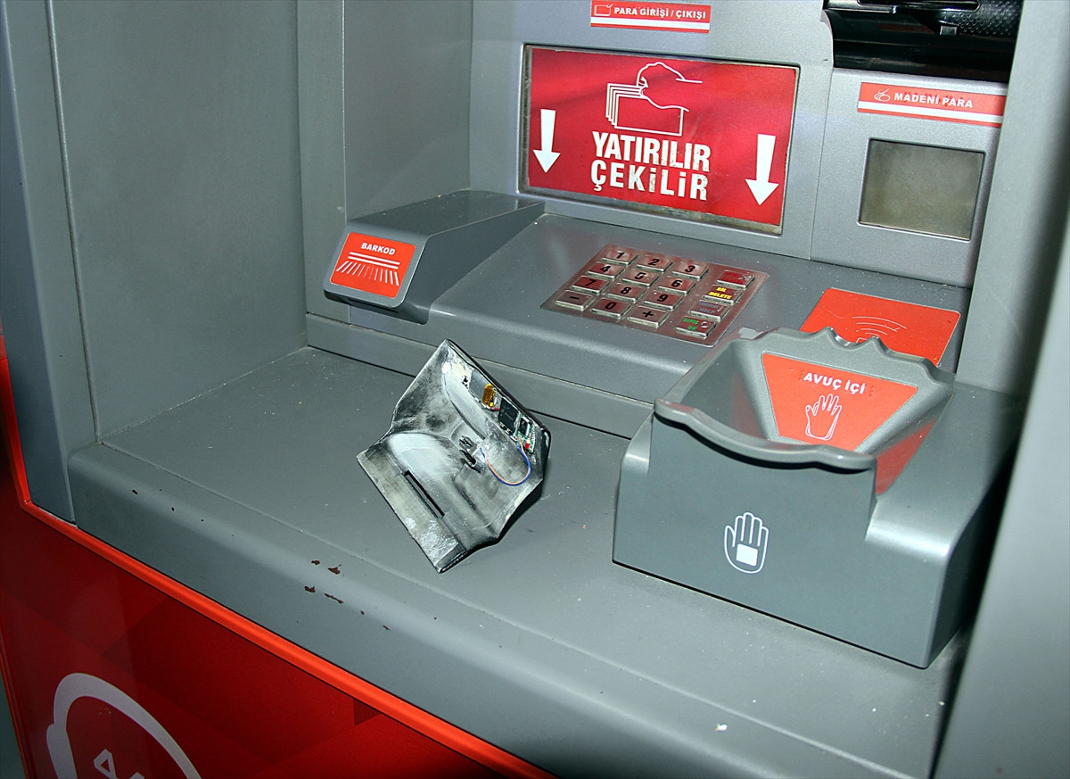 Olay yerine gelen İl Emniyet Müdürlüğü ekipleri yaptıkları çalışmada, ATM'nin kart yuvasının üst tarafına silikonla yapıştırılmış hafıza kartı ve bir küçük kameranın yerleştirildiği düzenek buldu.