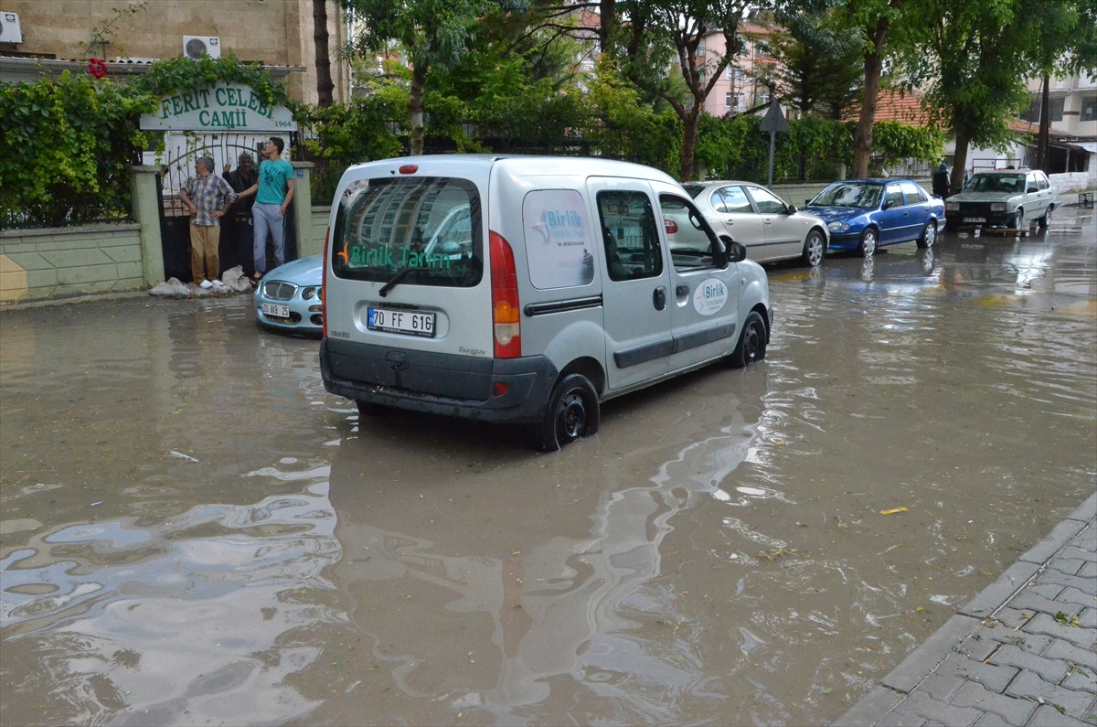 KARAMAN (AA) - Karaman'da sağanak yaşamı olumsuz etkiledi. Kentte, aniden bastıran yağışa hazırlıksız yakalananlar, iş yeri ve otobüs duraklarına sığınarak yağıştan korunmaya çalıştı. Sağanak nedeniyle Kazımkarabekir Mahallesi Gazi Osmanpaşa Caddesi su altında kaldı. Bazı araçlar su birikintisi nedeniyle ilerleyemeyince polis ekipleri caddeyi trafiğe kapattı.Belediye ekiplerinin tıkanan mazgalları açmasının ardından trafik normale döndü.Yağış nedeniyle bazı binaların alt katlarını su bastı. Vatandaşlar kovalarla evlerine giren suları tahliye etmeye çalıştı.
