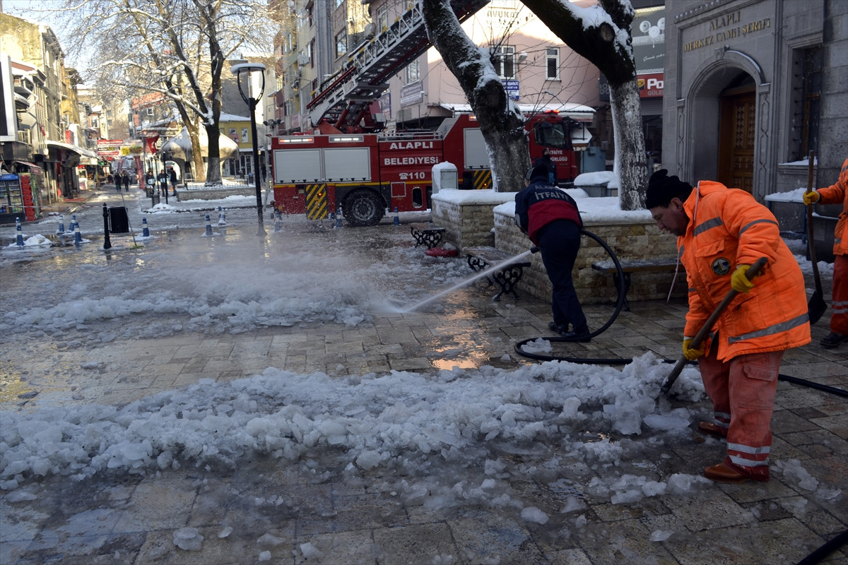 Alaplı Belediyesi ekipleri, buzla mücadele ve yolların kardan temizlenmesi için tuz dökmek yerine denizden çektikleri suyu itfaiye araçlarıyla cadde ve sokaklara püskürterek temizleme çalışması yaptı.