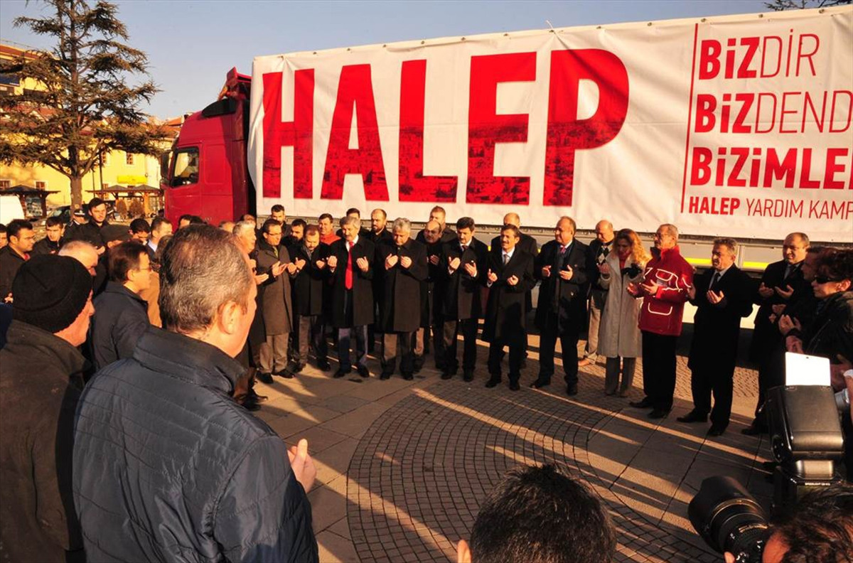 Konuşmanın ardından 350 çuval un, 70 koli gıda, 20 koli kişisel temizlik ile 14 koli yaşam malzemesi bulunan tır, yardımları Haleplilere ulaştırmak üzere yola çıktı.