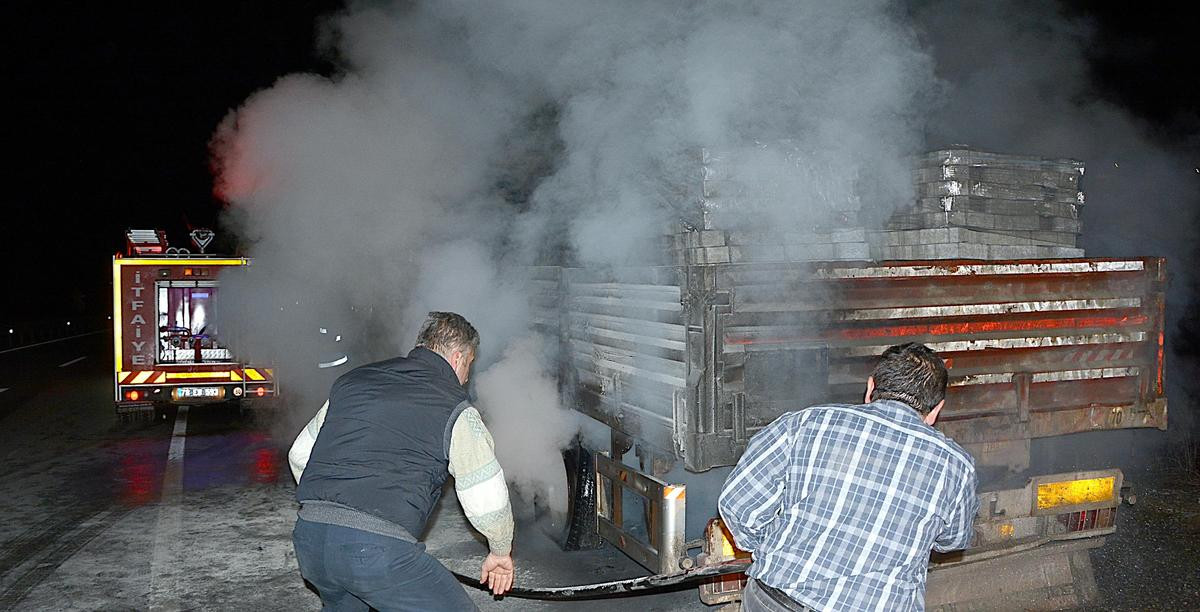 Durumu fark eden sürücü, tırı yol kenarına çekerek polise ve itfaiye ekiplerine haber verdi.