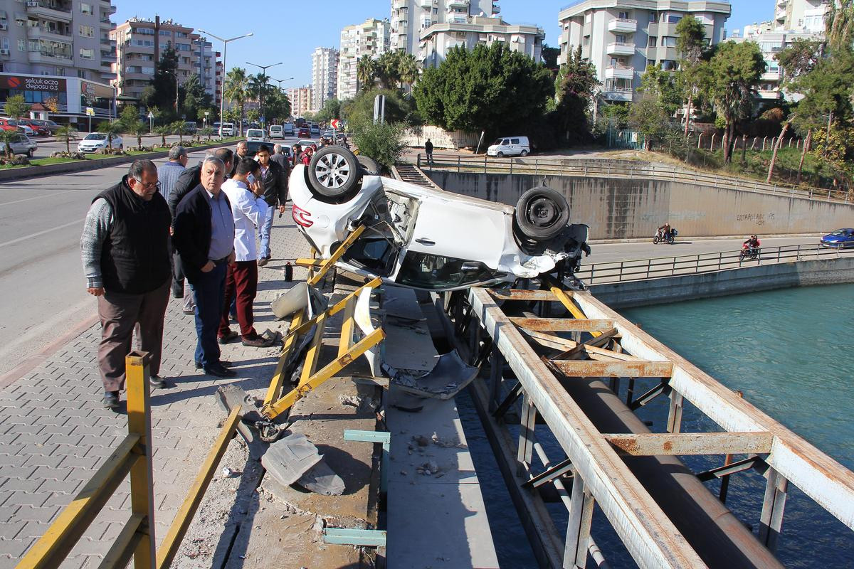 Alınan bilgiye göre, merkez Seyhan ilçesi Ziyapaşa Mahallesi Özdemir Sabancı Bulvarı'nda Ali Dalkır idaresindeki 01 DKE 55 plakalı otomobil, kontrolden çıkarak köprünün demir korkulukları ile köprünün 1 metre yanından geçen içme suyu borusunun korkuluklarında ters dönerek asılı kaldı.