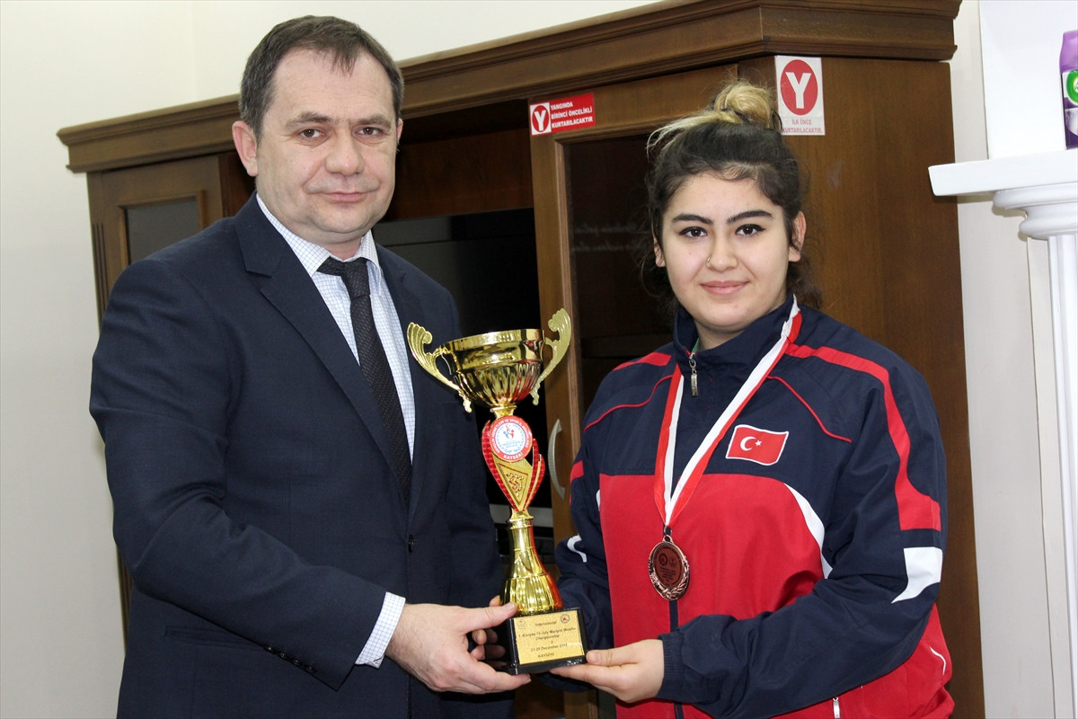 Gençlik Hizmetleri ve Spor İlçe Müdürü Kuyumcu da Ayfer Arslan'ın, 15 Temmuz Şehitleri anısına düzenlenen müsabakada üçüncü olduğunu belirterek, "Madalya ve kupasını ilimiz adına aldı ama müsabaka şehitler anısına olduğu için kupasını sizlere takdim etmek istedi. Biz de bu başarısını paylaşmak için sizleri ziyaret ettik." diye konuştu.
