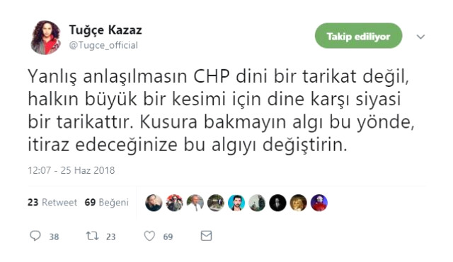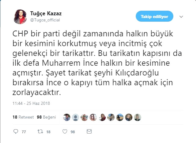 Gerek sosyal medyadan gerek çıktığı programlarda yaptığı açıklamalarla çok konuşulan Tuğçe Kazaz, yine bu açıklamalarından birine imza attı. Kaza soyal medya hesabından "CHP bir parti değil zamanında halkın büyük bir kesimini korkutmuş veya incitmiş çok gelenekçi bir tarikattır. Bu tarikatın kapısını da ilk defa Muharrem İnce halkın bir kesimine açmıştır. Şayet tarikat şeyhi Kılıçdaroğlu bırakırsa İnce o kapıyı tüm halka açmak için zorlayacaktır" dedi.