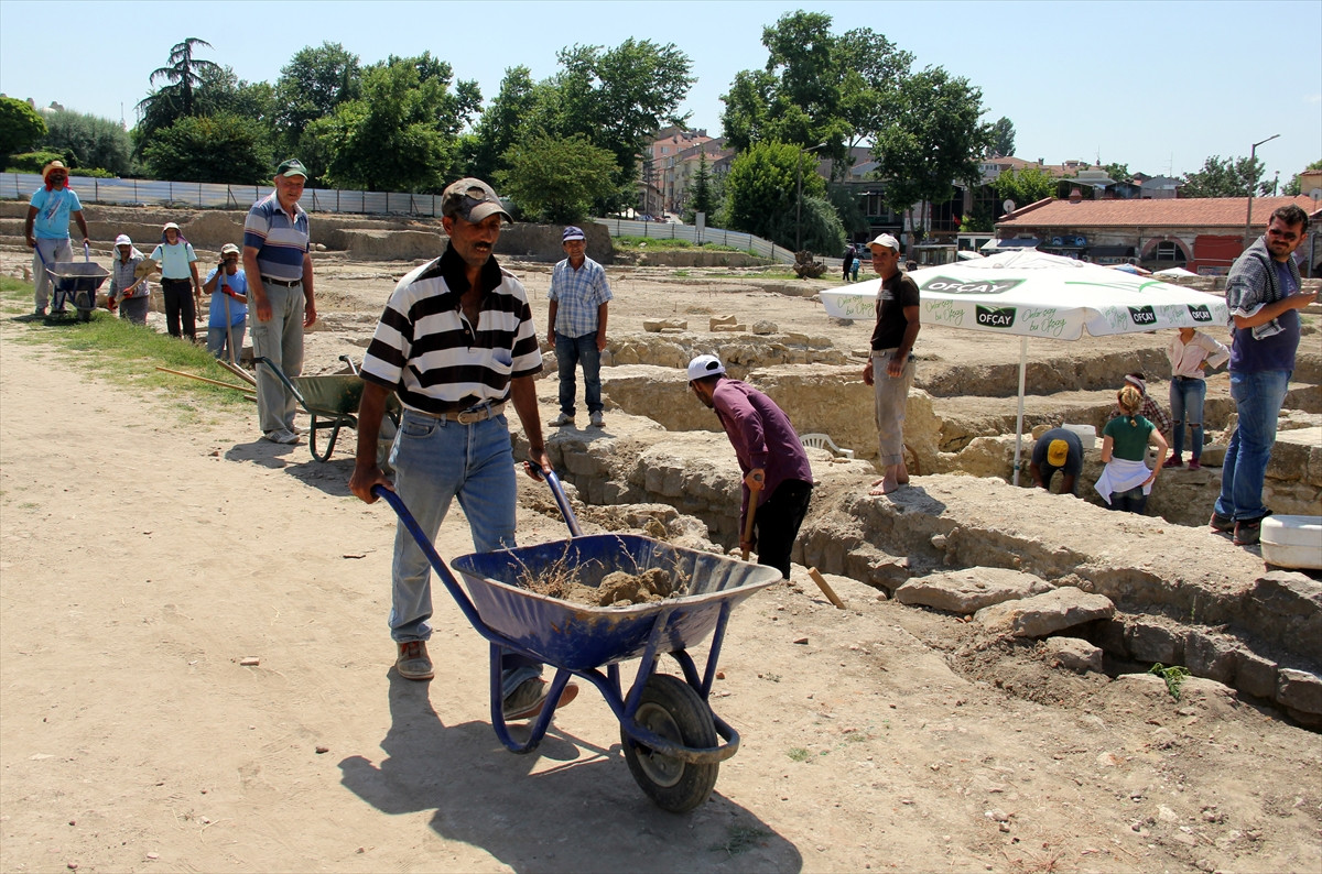 EDİRNE (AA) - Edirne Müze Müdürlüğü'nce gerçekleştirilen Tarihi Yemiş Kapanı Hanı kazı çalışmalarında görev alan işçiler güneşin altında hem kazı alanındaki işlerini yapıyor hem de oruç ibadetlerini yerine getiriyor.