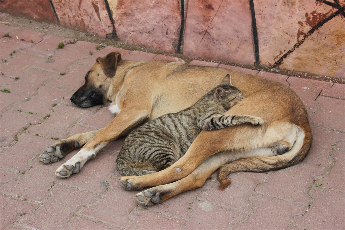 Azdavay'da sahipsiz kedi ve köpeğin arkadaşlığı, görenleri şaşırtıyor. Vatandaşların verdiği yiyeceklerle karınlarını doyuran kedi ve köpek, koyun koyuna yatarak güneşleniyor.