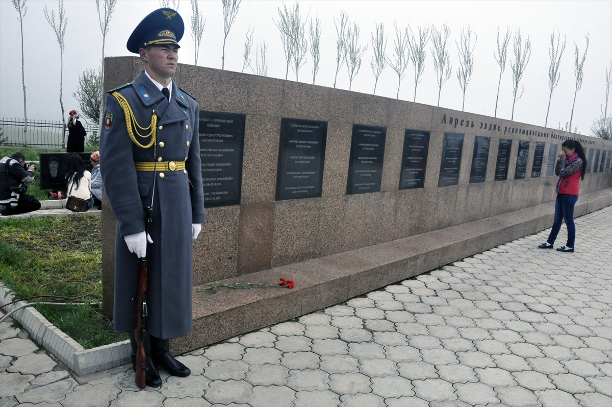 Cumhurbaşkanı Atambayev ile Roza Otunbayeva, halk ayaklanmasında hayatını kaybedenler için dikilen anıtın önünde düzenlenen askeri törende anıta çelenk koydu. Kur'an-ı Kerim'in okunmasının ardından toplu dua edildi. Kurbanların aileleri ve yakınları, sevdiklerinin mezarı başında dua edip gözyaşı döktü.