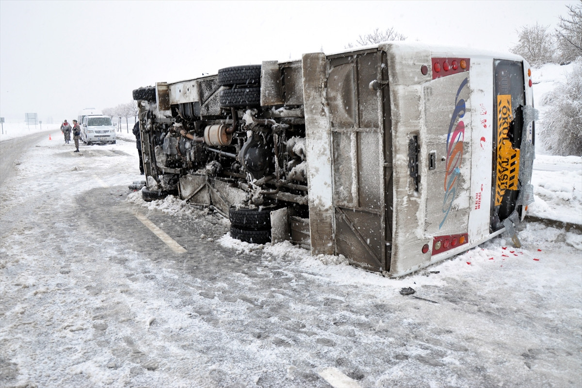 Kırıkkale'de T Tipi Kapalı Ceza İnfaz Kurumu görevlilerini taşıyan Şahin Aydın idaresindeki 71 S 0042 plakalı midibüs, Kırıkkale-Kayseri karayolunun 17. kilometresinde kar nedeniyle kayganlaşan yolda devrildi. Kazada sürücü Aydın ile araçta bulunan 25 ceza infaz kurumu memuru yaralandı. Kırıkkale Yüksek İhtisas Hastanesi ve Kırıkkale Üniversitesi Tıp Fakültesi Hastanesine kaldırılan yaralıların hayati tehlikesinin bulunmadığı öğrenildi.