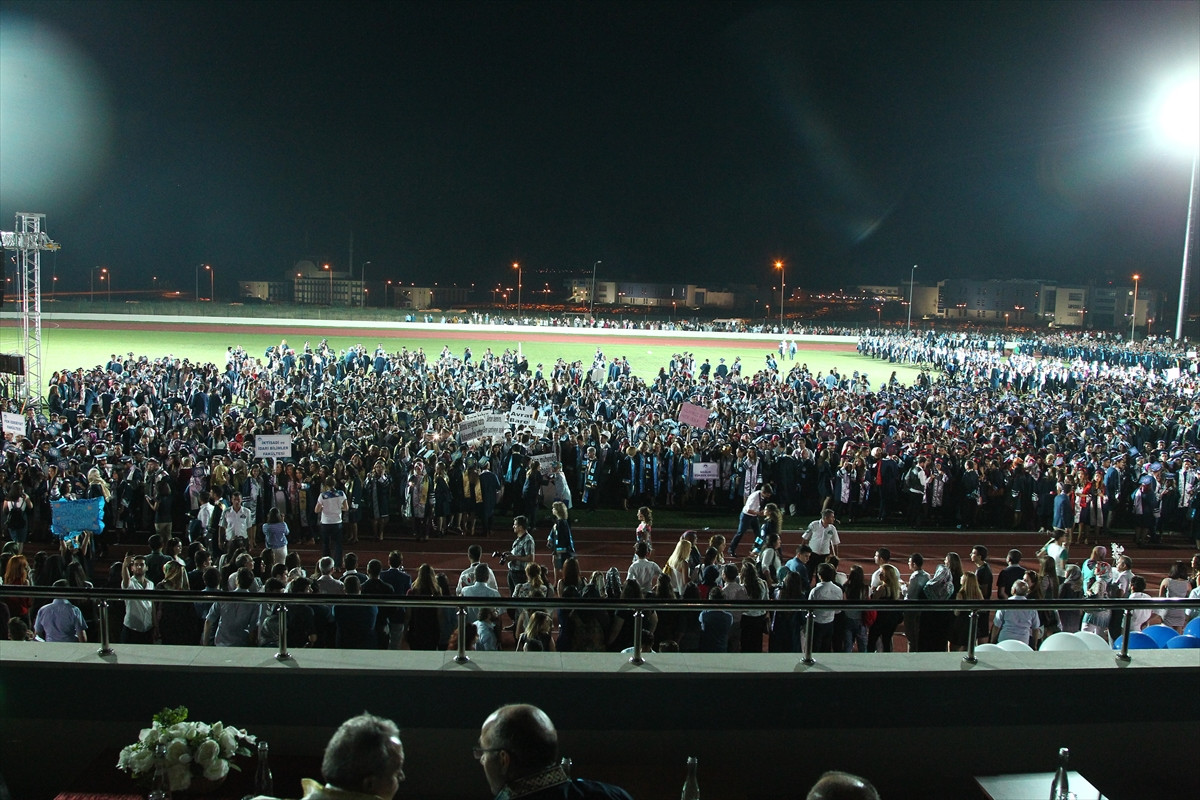 Kayalı Kampüsü futbol sahasında düzenlenen iftar programı sonrası gerçekleştirilen mezuniyet töreni, öğrencilerin kortej geçişiyle başladı.