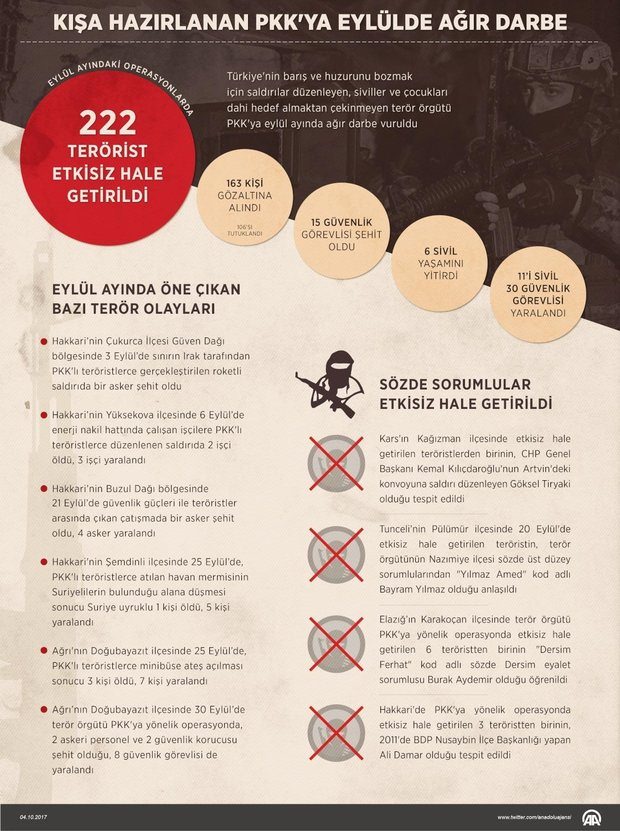 AA muhabirinin derlediği bilgilere göre, terör örgütü PKK mensuplarının 1-30 Eylül'deki saldırılarında 15 güvenlik görevlisi şehit oldu. İşçilerin de aralarında bulunduğu 6 sivilin yaşamını yitirdiği terörist saldırılarda 11 sivil de yaralandı. Operasyon ve terör saldırılarında yaralanan 30 güvenlik görevlisi tedavi altına alındı.