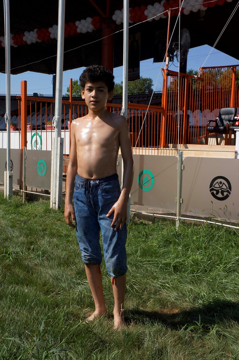 EDİRNE (AA) - 655. Tarihi Kırkpınar Yağlı Güreşleri'nde kispeti küçük gelen minik bir pehlivan, kot pantolonla güreşti.