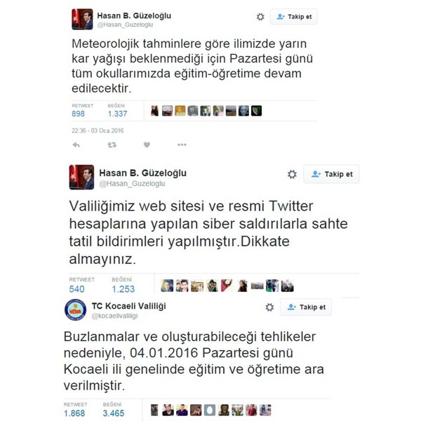 Kocaeli Valiliği’nin web sayfası ve Twitter adresi hacklendi. Kocaeli Valiliği’nin twitter hesabından, "Buzlanmalar ve oluşturabileceği tehlikeler nedeniyle 04.01.2016 Pazartesi günü Kocaeli ili genelinde eğitim ve öğretime ara verilmiştir" tweet’i atıldı. Tweet kısa sürede birçok kişi tarafından retweetlendi. İl Milli Eğitim Müdürlüğü web sayfasından açıklama yaparak eğitime devam edileceğini bildirdi. Kocaeli Valisi Hasan Basri Güzeloğlu da twitter hesabından, "Meteorolojik tahminlere göre ilimizde yarın kar yağışı beklenmediği için Pazartesi günü tüm okullarımızda eğitim-öğretime devam edilecektir" ve "Valiliğimiz web sitesi ve twitter hesaplarına yapılan siber saldırılarla sahte tatil bildirimleri yapılmıştır. Dikkate almayınız" tweet’lerini attı.