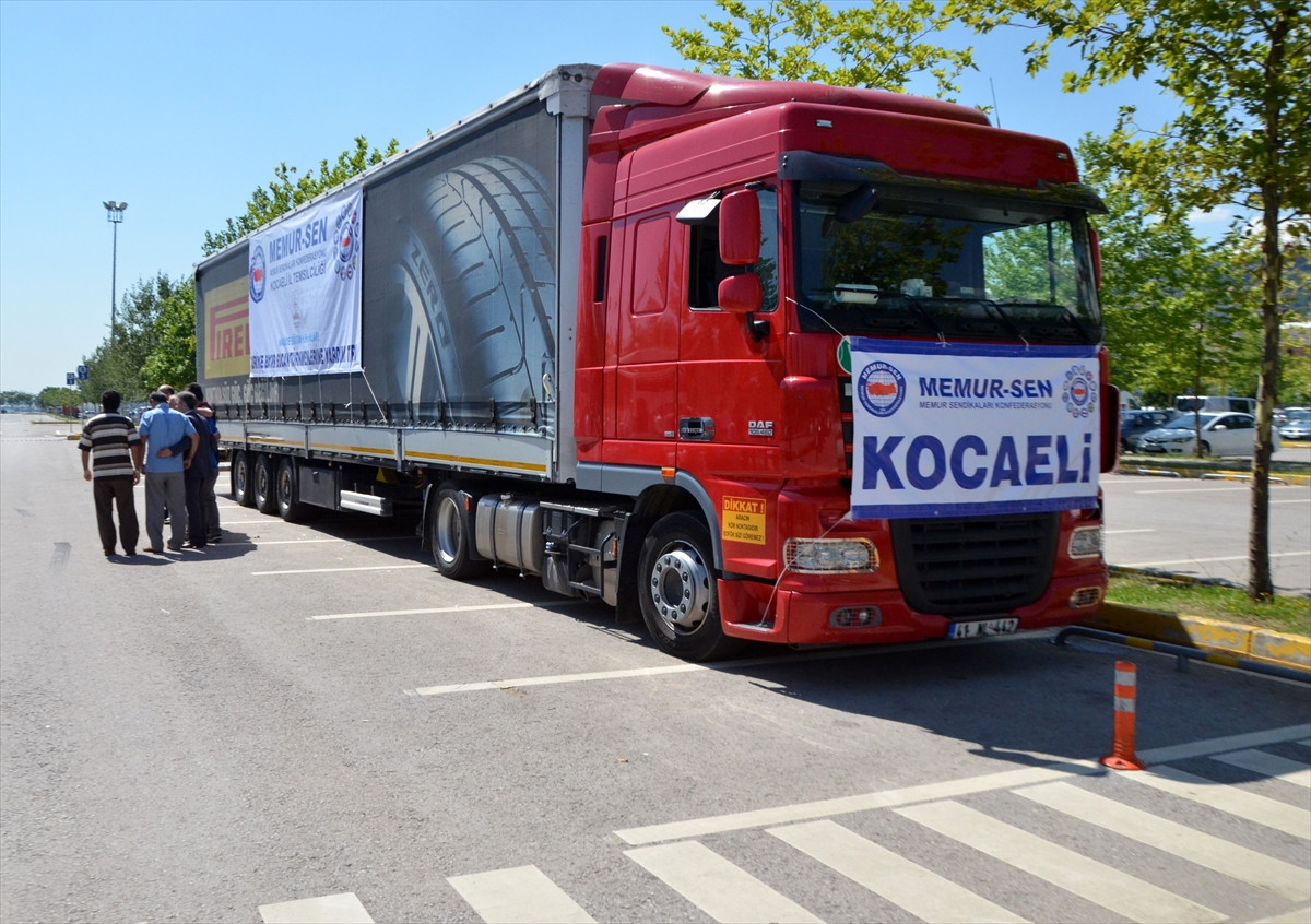 KOCAELİ (AA) - Memur-Sen Kocaeli İl Temsilciliği tarafından temin edilen içme suyu ve erzağın bulunduğu yardım tırı, Bayırbucak Türkmenlerine gönderildi.