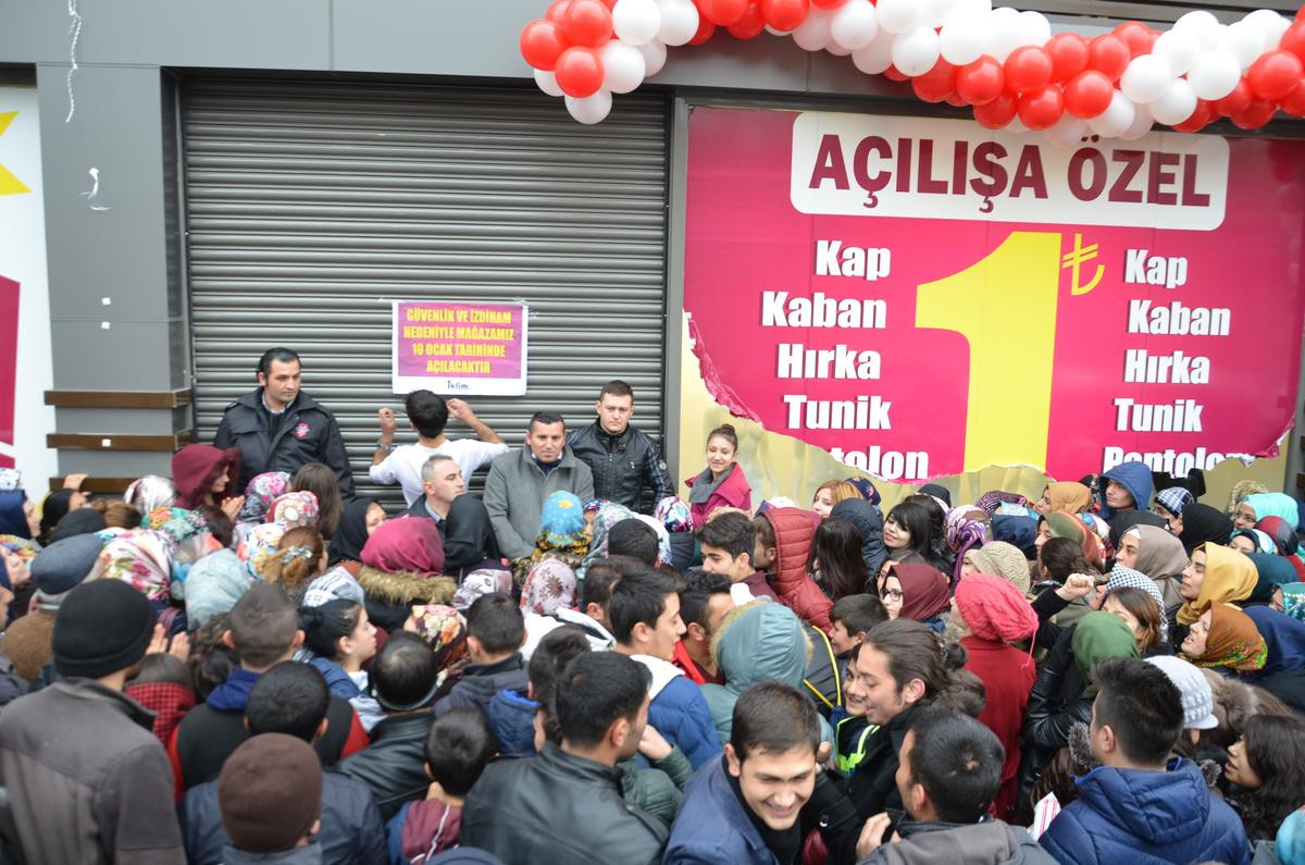 KONYA (AA) - Konya'da yeni faaliyete geçecek bir giyim mağazasında ürünlerin 1 liraya satılacağını duyan vatandaşlar izdihama neden olunca açılış ertelendi.