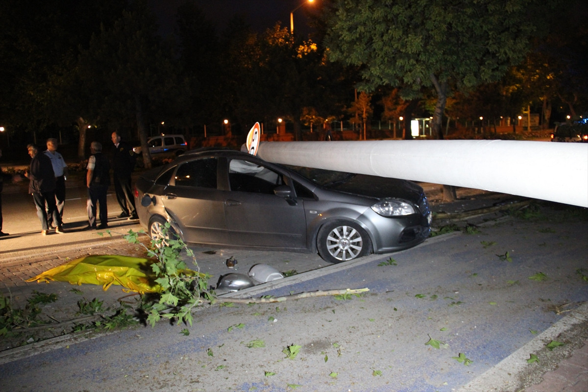 Çarpmanın etkisiyle beton direk otomobilin üstüne devrildi.