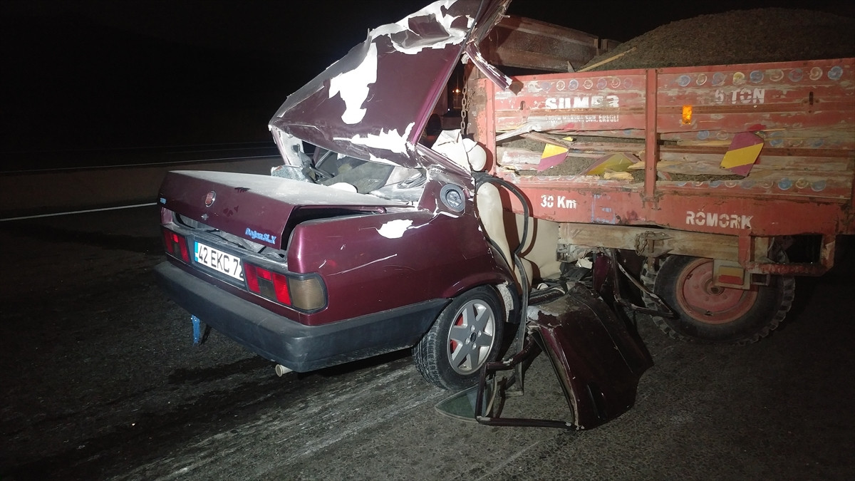 Ünsal Güngör (59) idaresindeki 42 EKC 72 plakalı otomobil, Ereğli Şeker Fabrikası yakınlarında Sacettin Başsoy (25) yönetimindeki 42 ESP 79 plakalı traktörün römorkuna arkadan çarptı.