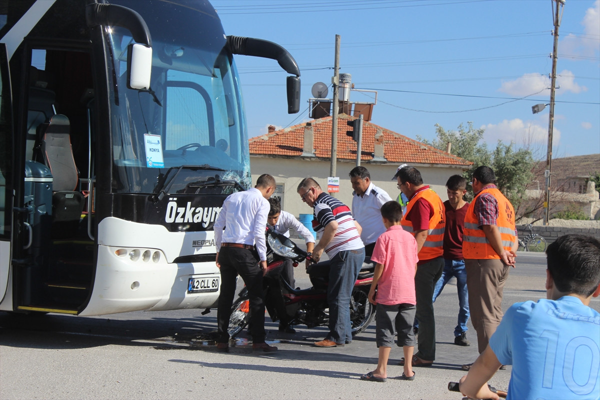 Alınan bilgiye göre, ilçenin 30 Ağustos Caddesi'nde Murat Y'nin kullandığı 42 CCL 60 plakalı yolcu otobüsü ile henüz sürücüsü belirlenemeyen 42 JG 985 plakalı motosiklet çarpıştı.